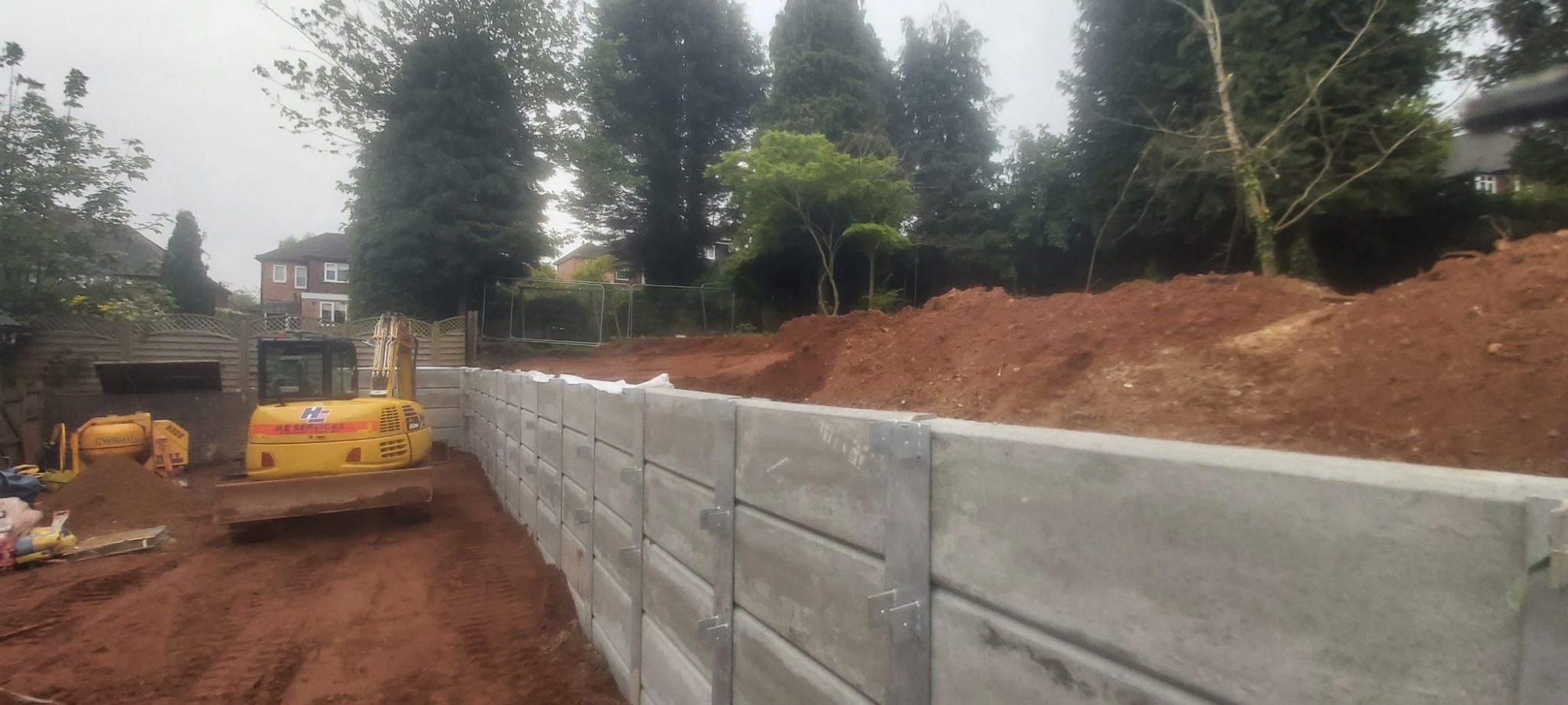 We have recently completed a small project in Royal Sutton Coldfield, on the outskirts of Birmingham. A property developer completed a development without consideration for a retaining wall in the rear garden of two properties. As a result of this a neighbouring timber building needed to be demolished, a reduced level dig completed and a king post wall constructed including a boundary fence and cladding.